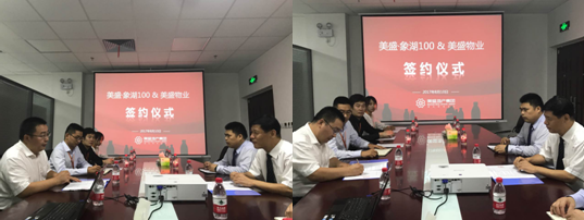 此次簽約儀式在象湖100項目公司會議室內舉行,象湖100項目公司總經理祁朝顯,營銷總監時荊成及河南美盛物業管理有限公司總經理趙建梁、鄭州分公司副總經理李剛等人共同參加。經過友好協商,本著平等互利的原則,雙方達成戰略合作關系。