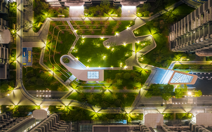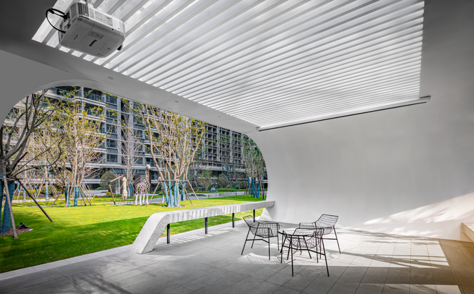 舉目環顧,飽含設計者智慧與巧思的圍合式排列建筑,帶來開闊視野,中心區域打造景觀大中庭消弭了建筑的壓迫感,充足的戶外空間、起伏有致的坡地景觀,讓開闊感與通透感撲面而來。