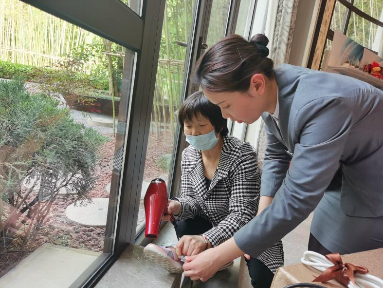 見此情景,項目客服人員來不及多想,穿著高跟鞋就直接踩進水里,抱起孩子,順利把孩子交給奶奶后,客服不放心,擔心鞋子濕了會影響孩子的健康,去二樓拿吹風機把孩子濕透的鞋襪吹干了,奶奶感激的說到:“小孩子太調(diào)皮了,謝謝,謝謝你們!”“您客氣了,這是我們應該做的”客服微笑著回答。